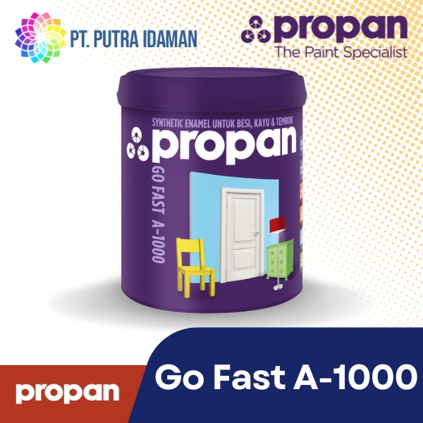 Propan Go Fast A-1000 adalah cat sintetik serba guna berpengencer air yang cepat kering, mempunyai daya lekat yang kuat ke substrat, tahan cuaca, mudah diaplikasikan, warna tahan lama, tidak mudah pudar, mempunyai daya tutup yang baik, ramah lingkungan dan tidak beracun. GO FAST A-1000 sangat tepat diaplikasikan pada besi, kayu, beton, papan fiber cement, fiberglass, dll, baik di luar maupun di dalam ruangan.